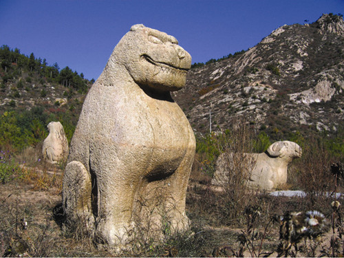 墓地原有石像生三十六件,现存石虎5只,石羊4只,石人两尊。精雕细镂、形神兼备,经千年风雨侵蚀,保存完好,体现了辽代艺术之精湛。清澈的辽河源头之水缓缓流经墓前,墓地前有并蒂山相照,后有五峰毗连,北侧山巅三尖柱石矗立,号称"三炷香",竟成天然供奉。墓地青山峻岭掩映,碧水从林环绕,可谓山发脉绵远,水朝拜含情,呈典型的风水宝地之势。